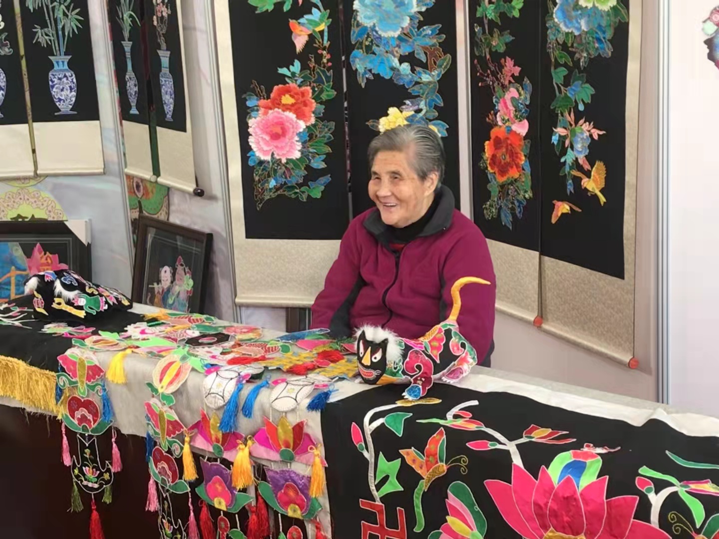 她憑借一雙巧手,自主創(chuàng)作了100余件布貼作品,代表作品《招財(cái)童子》抱被、《哪吒鬧?!辐P尾帽等20余件作品在上海世博會(huì)等非遺博覽會(huì)展出并大放異彩。