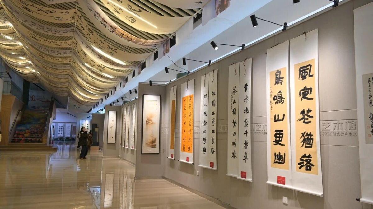 1月12日,記者走進藝術(shù)館,最先吸引視線的是頭頂那條“書法的河流”。數(shù)不清的米黃色長卷從屋頂蜿蜒垂下,上面寫滿了草書、行書和楷書,將整個長廊包裹成一條充滿墨香的隧道。長廊兩側(cè)的淺灰色展墻上,多幅裝裱好的書法作品、國畫和現(xiàn)代繪畫錯落有致地懸掛著,構(gòu)成了藝術(shù)館的核心區(qū)域——藝術(shù)展覽區(qū)。