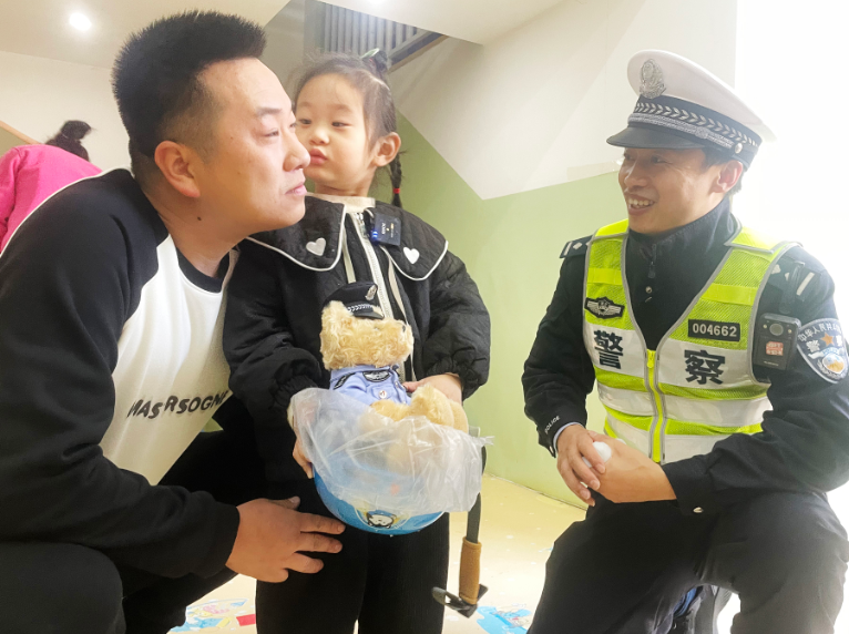 7日上午,市公安局交巡警支隊(duì)黃石港大隊(duì)二中隊(duì)中隊(duì)長(zhǎng)明啟軍、指導(dǎo)員李璠來到謝欣欣的餐飲店,向他的推車善舉表示感謝。得知謝欣欣有一兒一女,民警特意準(zhǔn)備了兒童頭盔、小警熊、警用摩托車玩具等禮品,利用中午放學(xué)時(shí)間,和謝欣欣一起來到幼兒園和學(xué)校,將禮物送給謝欣欣的子女。