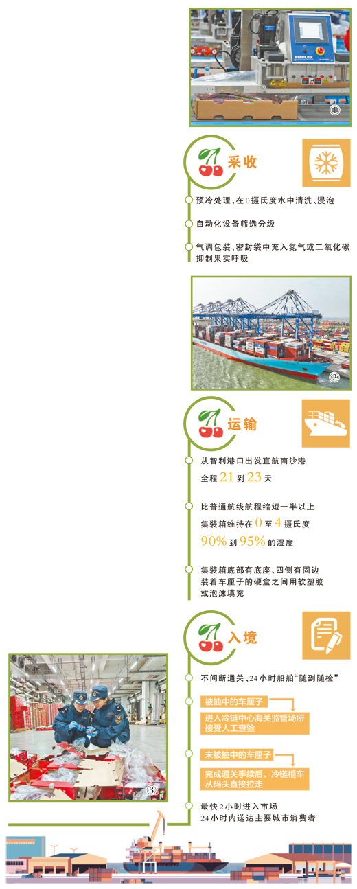 經(jīng)預(yù)冷、“休眠”的車?yán)遄樱臏囟冉抵?攝氏度左右,隨即每5斤一盒包裝完畢,再逐盒整齊地碼入自帶空調(diào)壓縮機的集裝箱,在全程冷鏈中完成接下來的“漂洋過海”。“裝箱時,智利相關(guān)農(nóng)業(yè)監(jiān)管部門會派人在現(xiàn)場核驗貼綠標(biāo),這是依據(jù)中智雙邊簽訂的檢驗檢疫議定書開展的監(jiān)管行為,既確保中國消費者‘舌尖上的安全’,又能提升到港后的海關(guān)查驗效能?!睆V州海關(guān)所屬南沙海關(guān)副關(guān)長陳榮溢表示。
