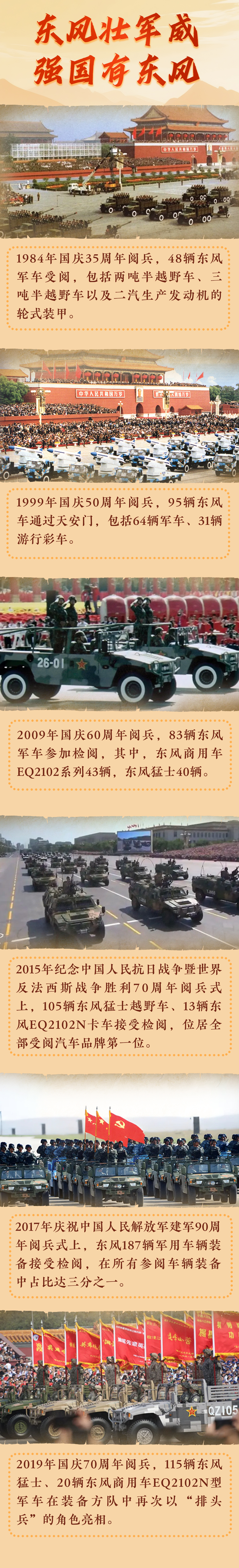 東風(fēng)因軍而建、因軍而興、因軍而榮,這支從鄂西北山溝中走出的“鋼鐵長(zhǎng)城”,用超越半個(gè)世紀(jì)的堅(jiān)守,鑄就了中國(guó)軍車(chē)第一品牌的傳奇?;仡櫄v史,東風(fēng)汽車(chē)已經(jīng)6次光榮接受黨和人民檢閱,其中在2009年,走過(guò)一個(gè)甲子年的共和國(guó)迎來(lái)60華誕,40輛東風(fēng)“猛士”首次作為引導(dǎo)車(chē)出現(xiàn)在了閱兵大典中。