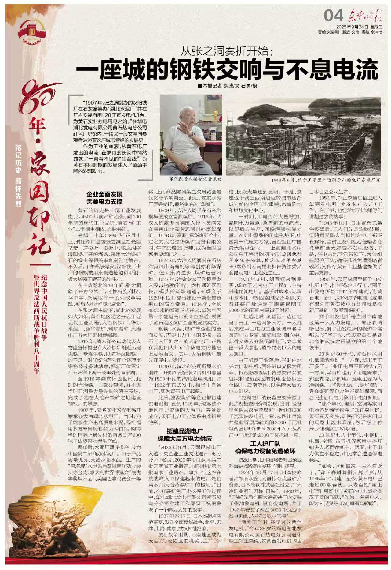 “1945年8月,日本宣布無(wú)條件投降后,工人們先是歡欣鼓舞,但隨后又陷入到擔(dān)憂之中?!编嵳忉?,當(dāng)時(shí)工友們擔(dān)心侵略者在撤離前會(huì)大肆破壞發(fā)電設(shè)備,于是,在中共地下黨帶領(lǐng)下,大伙組建起護(hù)廠隊(duì),確保機(jī)器免遭侵略者破壞,為保存黃石工業(yè)基礎(chǔ)提供了重要支持。