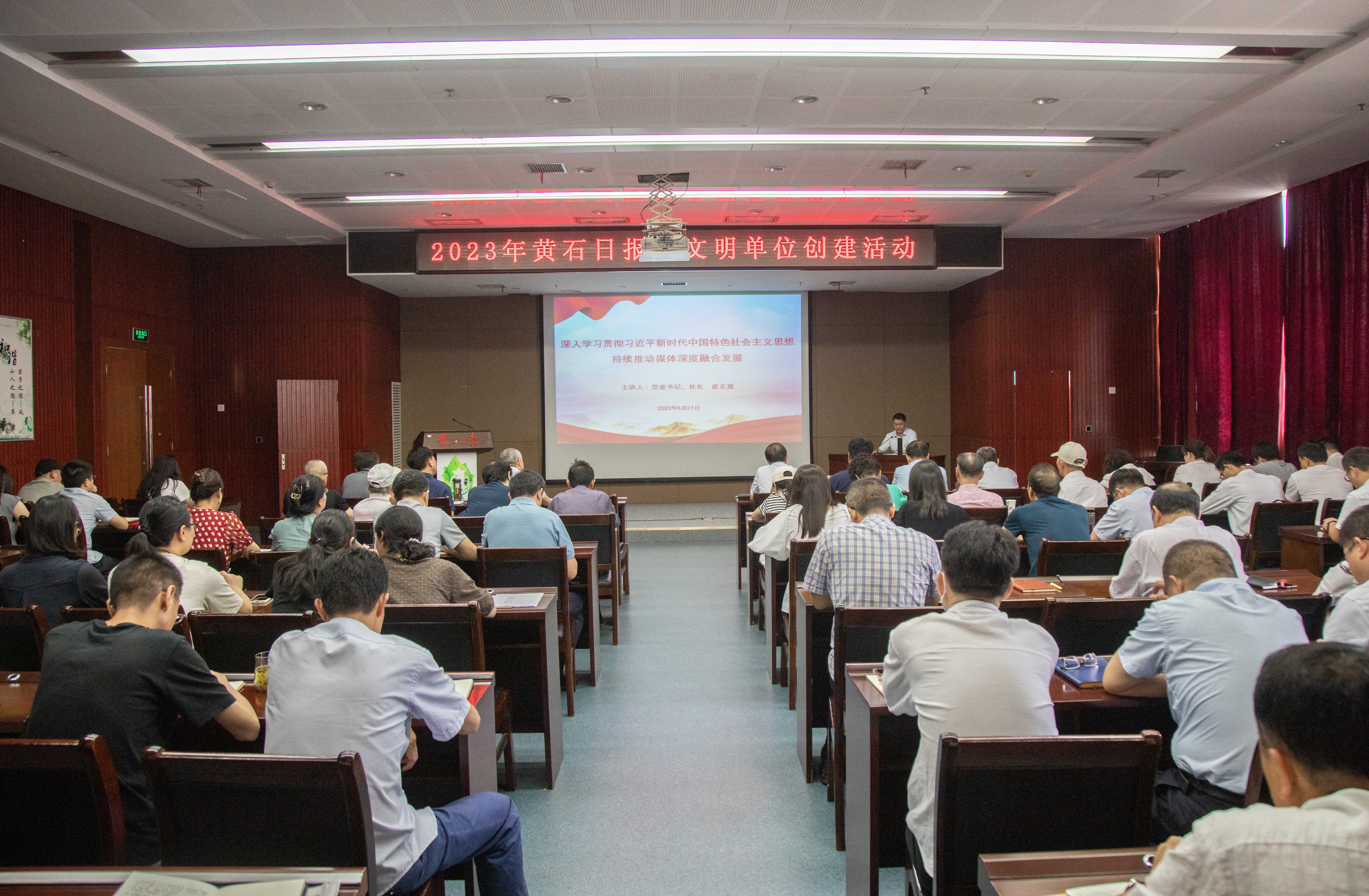 6月21日下午,為進(jìn)一步加強(qiáng)文明單位的創(chuàng)建與管理,黃石日?qǐng)?bào)社在報(bào)社三樓學(xué)習(xí)報(bào)告廳開(kāi)展習(xí)近平新時(shí)代中國(guó)特色社會(huì)主義思想專(zhuān)題學(xué)習(xí)。報(bào)社黨委書(shū)記、社長(zhǎng)皮正茂同志圍繞“深入學(xué)習(xí)貫徹習(xí)近平新時(shí)代中國(guó)特色社會(huì)主義思想,持續(xù)推動(dòng)媒體深度融合發(fā)展”,給大家上了一堂生動(dòng)的黨課,深刻闡述了媒體融合發(fā)展的時(shí)代意義、深入分析了媒體融合發(fā)展的現(xiàn)實(shí)困境,并對(duì)積極推進(jìn)媒體融合發(fā)展提出了建議和要求,對(duì)提升黨員干部能力水平,積極推進(jìn)報(bào)社“第三次創(chuàng)業(yè)”有很強(qiáng)的針對(duì)性和指導(dǎo)性。黃石日?qǐng)?bào)社全體黨員干部參加了學(xué)習(xí)。(記者?周巍?攝)