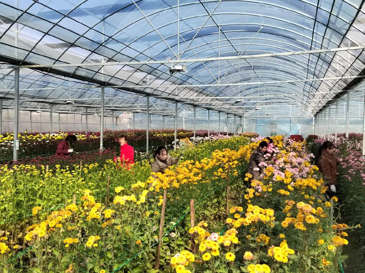 工人在大棚內(nèi)采摘菊花